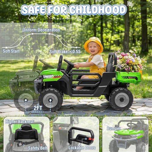 12V Ride On Dump Truck, 400W Power Ride On Toys w/Parent-Override Remote, 3 Speed, Electric Dump Bed & Shovel, Shock Absorbers, Led Light, Bluetooth & Gift Bow, Electric Car for Toddlers, Green
