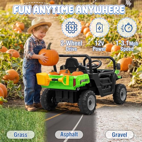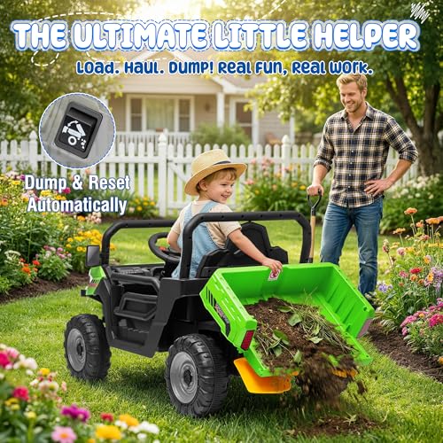 REAL DUMP TRUCK ACTION: Nothing sparks imagination like a real working dump bed! With the touch of a button, kids can load, haul, and dump sand, toys, or garden goodies. The included mini shovel adds to the authentic experience. Whether it’s “construction site” in the sandbox or “helping” with yard work, this electric vehicle turns everyday moments into lessons in responsibility and creativity.