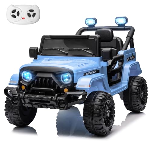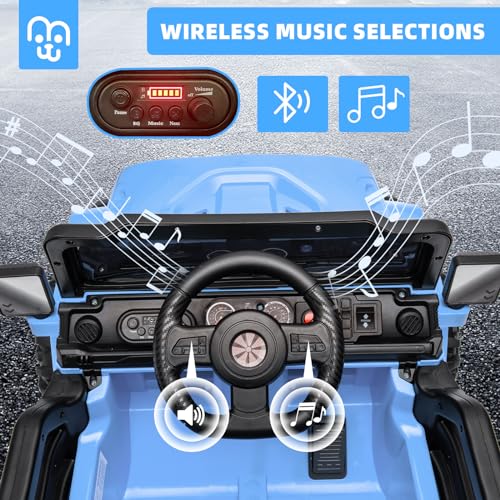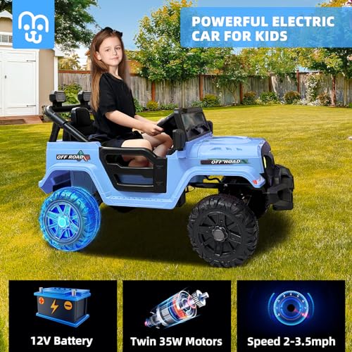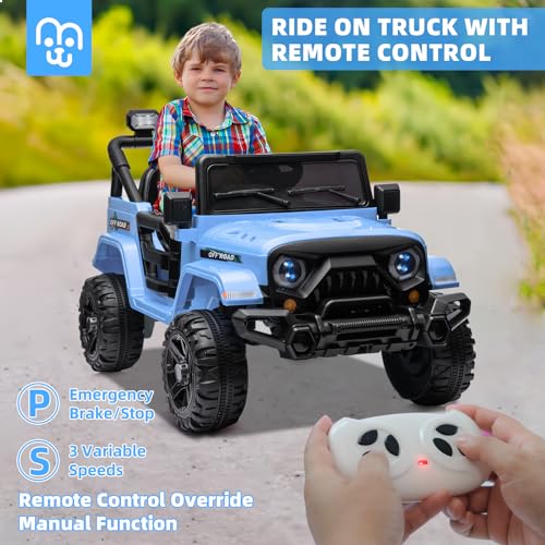 MINIATURE MOTORS 12V Kids Electric Ride on Truck Car Remote Control, Twin 35W Motors 3.5MPH Max Speed, Bluetooth Music Player, 4 Wheels Suspension LED Lights Safety Belt, Gift for Boys & Girls-Blue