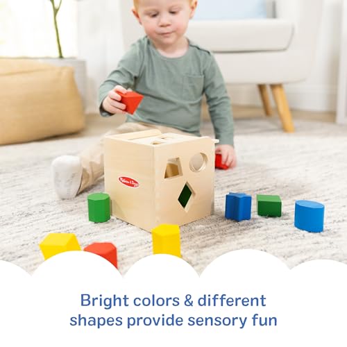CREATIVE SORTING GAME FOR KIDS: The Melissa & Doug Shape-Sorting Cube Classic Wooden Toy is a beautifully constructed wooden toy with 12 bright-colored, easy-to-grip shapes.