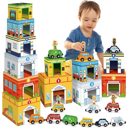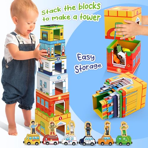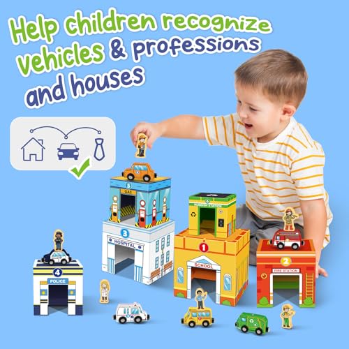【Stacking Toys for Toddlers】: The stacking toys set includes 6*colorful cardboard nesting boxes, including Hospital, School, Police, Fire Station, Gas Station, and Rubbish Station, 6* wooden community helper figures and 6*magnetic wooden cars, and 1* storage bag.The stacking building blocks are printed with corresponding occupation images and numbers.