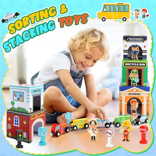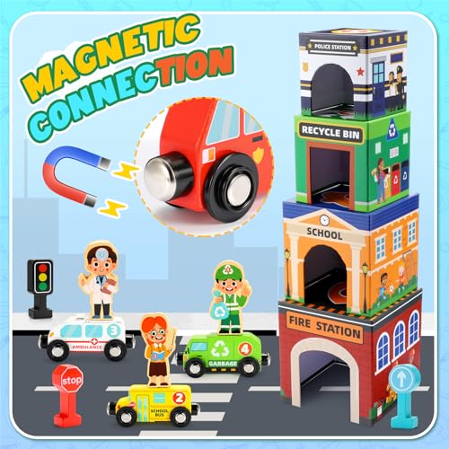 Baby Stacking Toys for Toddlers, Magnetic Wooden Cars & Garage Sorting Community Helpers Preschool Educational Learning Montessori Toys Birthday Gifts for Kids Number Blocks Nesting Boxes