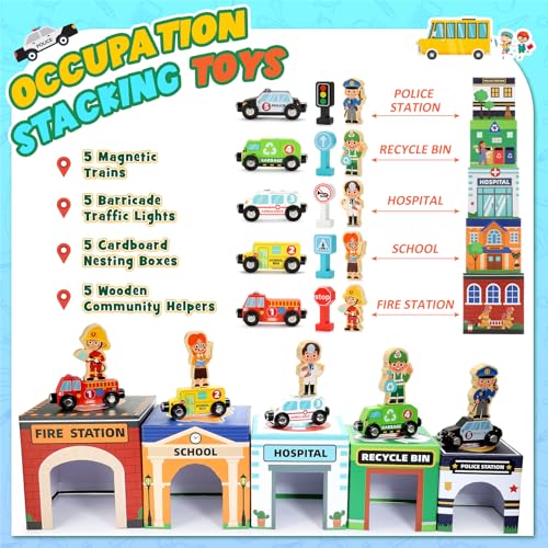 【Stacking Toys for Toddlers】This imaginative playset includes 5 stacking garages, 5 magnetic wooden cars, 5 road signs, and 5 wooden professional figures. Each stacking garage is themed around a different occupation, sparking your child’s curiosity and creativity. Watch as they develop essential hands-on skills while exploring the world of firefighters, police officers, and more