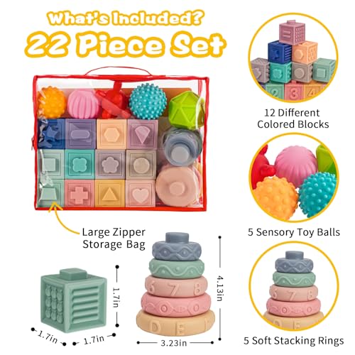 What’s Included?The montessori toys set comes with 12 different color stacking blocks, 5 soft stacking rings, 5 sensory balls that squeeze to make sound.Each building block, which features different bright and enticing colors, has best size for baby’s hands,easy for them to pick up and stack.Great sensory toys for 6-12 months old babies.