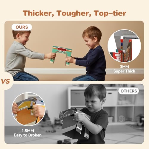 CUSTOMIZABLE RACE TRACK: Expand the fun! Unlike standard stacking toys, this set includes 12 wooden track pieces (4 straight, 4 curved, 4 flags) that kids can design themselves. Integrate the tracks with the community buildings to create a bustling city layout, boosting spatial reasoning and creative building skills