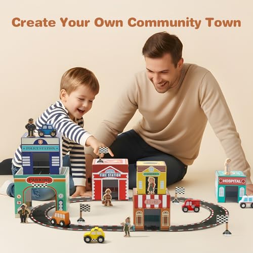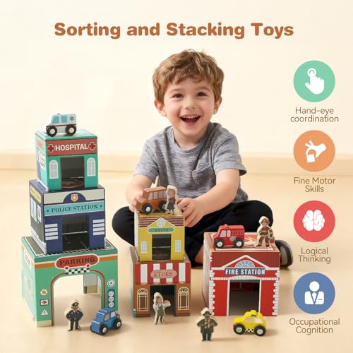 BUILD A VIBRANT COMMUNITY: Spark imaginative play! The 6 extra-thick cardboard nesting boxes feature vibrant scenes: fire station, police, hospital, school, grocery store, & a large garage. Paired with 6 wooden community helpers & 5 vehicles, kids can sort, match, stack, and create endless preschool learning stories