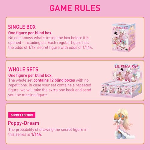 POP MART Lil Peach Riot Sleepover Series Figures: The blind box contains a random figure from a specific series. Each blind box only contains one figure. No one, including us, knows what’s inside. This collection contains 12 blind box figures, one of them might be the secret edition.