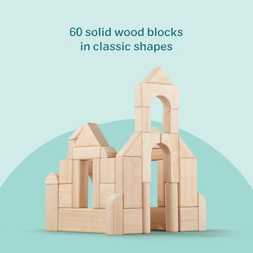 Classic Montessori Toys: Includes 60 natural-finish unit blocks in multiple shapes & sizes, precisely cut from smooth hardwood & packed in a portable wooden toy storage tray for quick & easy cleanup