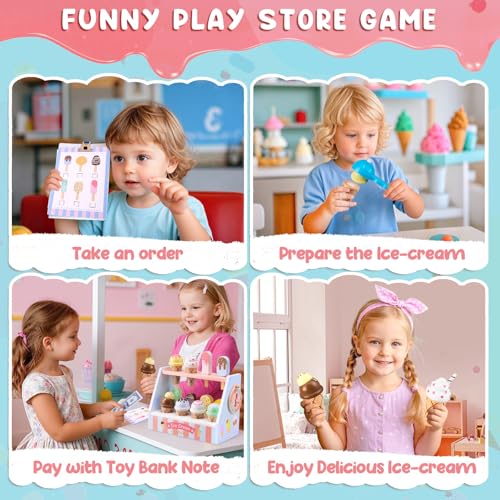 Ehome Wooden Ice Cream Toys Set Pretend Play Food Store for Kids Serve Ice Cream Counter Shop Kitchen Playset with Lucky Wheel, Scoop, Menu, Fake Money for Boys and Girls Ages 3 4 5 6 Birthday Gift
