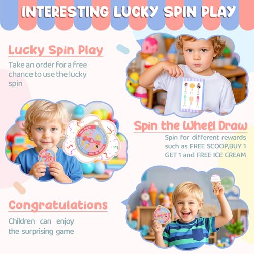 INNOVATIVE LUCKY WHEEL DESIGN: Unlike ordinary sets, our upgraded ice cream counter features a spinning “Lucky Wheel” to determine the flavor of the day. This unique feature adds excitement and variety to role-play, keeping kids entertained and engaged for hours.