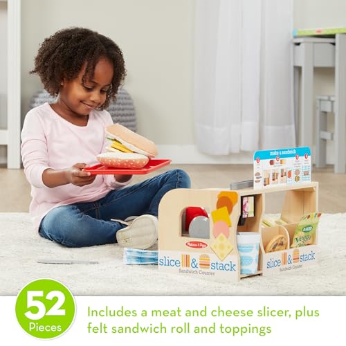 Serve up deli-fresh fun with the Melissa & Doug Wooden Sandwich Counter, kids kitchen playset! Young chefs can slice, stack, and serve custom sandwiches with 52 pretend play kitchen toys, including wooden meats, cheeses, and dressing bottle, a felt sandwich roll and toppings—plus chips, cookie, and a drink cup. The sturdy wooden deli counter also features a working slicer, a double-sided sign with menu and sandwich prep instructions, and play money to pay for each order. It’s a deliciously fun way to build counting, sorting, sequencing, and fine motor skills, with premium quality wooden toys for toddlers that inspires imaginative storytelling play.