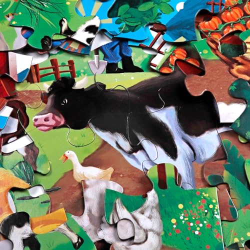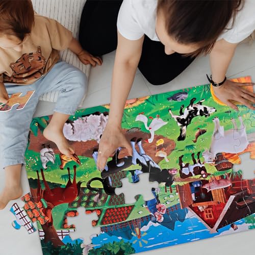 Excellent Gift Idea:Measuring 35.4×23.5 inches when fully assembled, the puzzle offers an optimal size for collaborative play with friends and family. It comes in a gift box for convenient portability and storage. This farm animal puzzle proves to be an outstanding gift suggestion for birthdays, Christmas, and Easter, suitable for children aged 4-10 who exhibit an interest in learning about farms and the world around them