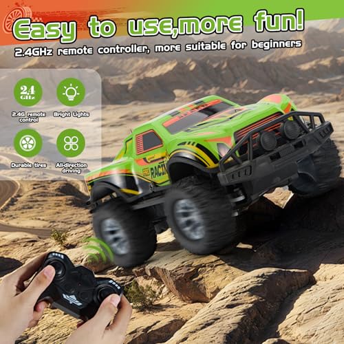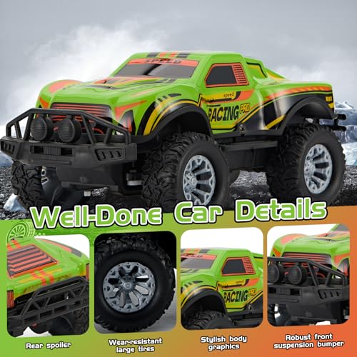 REMOTE CONTROL: 2.4GHz wireless remote controller enables precise all-direction driving control, perfect for beginners to master monster truck maneuvers . features astonishing stunt capabilities and fashionable body design. Young drivers can maneuver the remote-controlled car to overcome any obstacles
