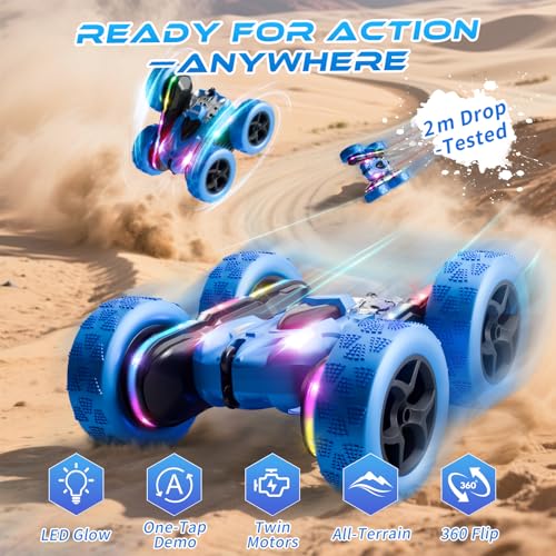 Remote Control Stunt Car 4WD 360° Flip Double‑Sided RC Cars, LED Light Bar, USB‑C Modular Battery, 2.4 GHz Outdoor Beach Toy for Boys 6‑12 Years Old, Birthday & Christmas Kids Gift, Blue